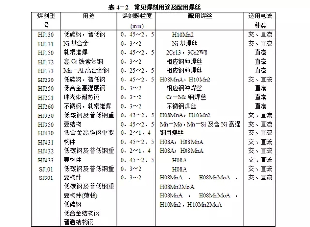 低碳鋼的焊接可選用高錳高硅型焊劑,配合H08MnA焊絲,或選用低錳、無錳型焊劑配H08MnA、H10Mn2焊絲。低合金高強度鋼的焊接可選用中錳中硅或低錳中硅型焊劑配合與鋼材強度相匹配的焊絲。 耐熱鋼、低溫鋼、耐蝕鋼的焊接可選用中硅或低硅型焊劑配合相應(yīng)的合金鋼焊絲。鐵素體、奧氏體等高合金鋼,一般選用堿度較高的熔煉焊劑或燒結(jié)、陶質(zhì)焊劑,以降低合金元素的燒損及摻加較多的合金元素。不同鋼種焊接用的焊劑與焊絲配用見表。