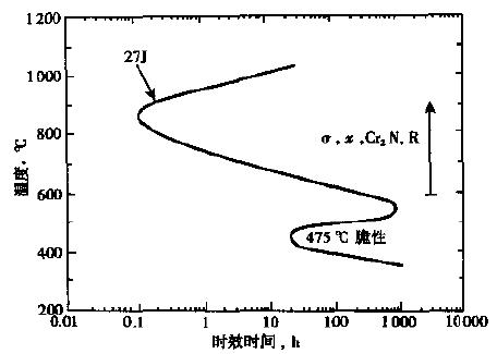 SAF 2507雙相不銹鋼管學性能 表1列出鋼管和鋼板的室溫力學性能,表2為鋼板的高溫力學性能。圖1為相應(yīng)韌性為27J的時間–溫度–相變曲線。有σ相和475℃兩個脆性區(qū)。 表1 SAF 2507雙相不銹鋼的室溫力學性能 鋼種 鋼材品種 σb ∕MPa σ0.2 ∕MPa δ5 ∕% HV AK ∕J SAF 2507 壁厚<20mm 管 800~1000 ≥550 ≥25 290 熱軋鋼板 730 530 20 60 表2 SAF 2507雙相不銹鋼的高溫力學性能 鋼種 鋼材品種 溫度 ∕℃ σ0.2 ∕MPa SAF 2507 鋼板 室溫 ≥530 100 ≥450 200 ≥400