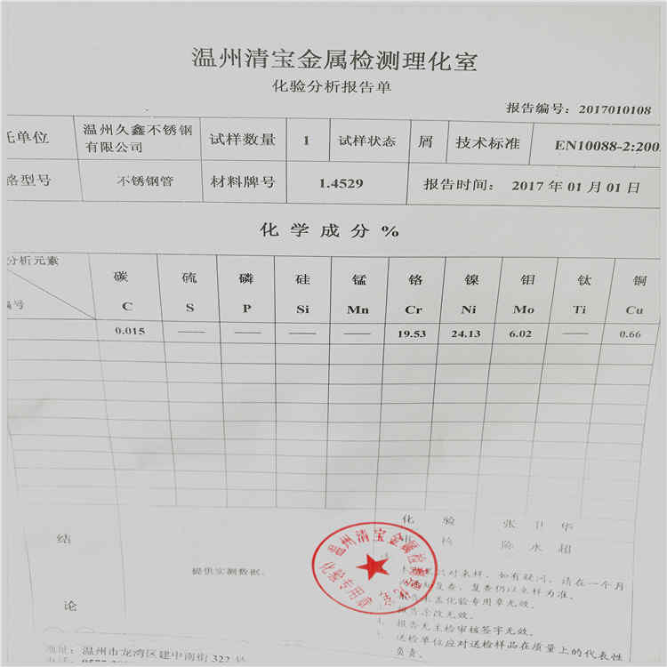 1.4529材質(zhì)不銹鋼無縫管化驗(yàn)報告